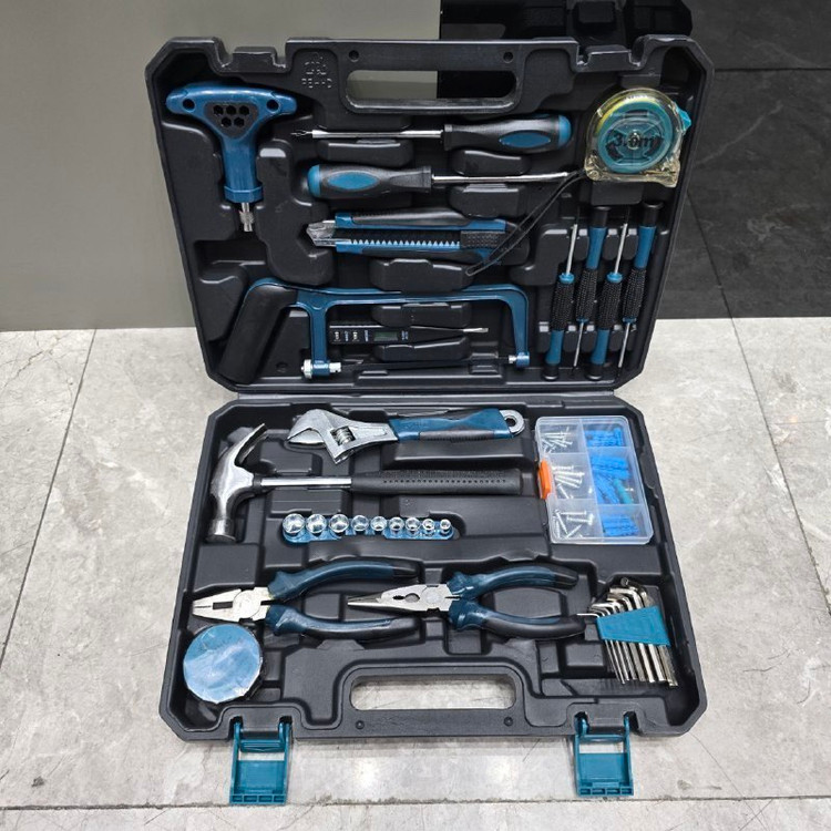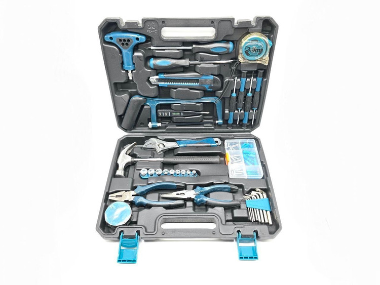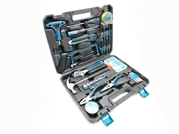 آچار فرانسه سایز ۸، انبردست، دمباریک، چراغ قوه LED، چکش با میخ کش، مجموعه هشت عددی آچار آلن، کاتر سایز بزرگ روکش دار، بکس تک سایز ۴ تا ۱۳، متر ۳ متری روکش دار، پیچ گوشتی دوسو و چهارسو سایز بزرگ، چهار عدد پیچ گوشتی سایز ریز دو سو و چهار سو، دسته پیچ گوشتی T نوک خوربکسی، ۹ عدد نوک پیچ گوشتی، تبدیل نوک پیچ گوشتی به بکس چسب برق، فازمتر دیجیتال، دو سایز پیچ گوشتی موبایلی دو سو و دو سایز پیچ گوشتی موبایلی چهارسو، کمان اره چوب و فلز، مجموعه سایزبندی پیچ و رولپلاک
