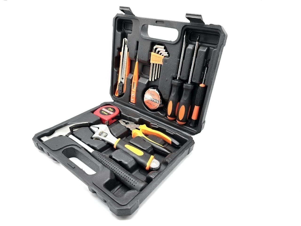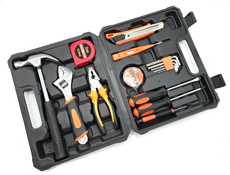 آچار فرانسه سایز ۸ روکش دار، انبردست، چکش میخ کش فلزی، مجموعه آچار آلن، کاتر سایز بزرگ روکش دار، متر ۲ متری ، پیچ گوشتی دوسو و چهارسو سایز بزرگ، پیچ گوشتی چهار سو سایز ریز، چسب برق، فازمتر دیجیتال، پیچ گوشتی موبایلی چهارسو