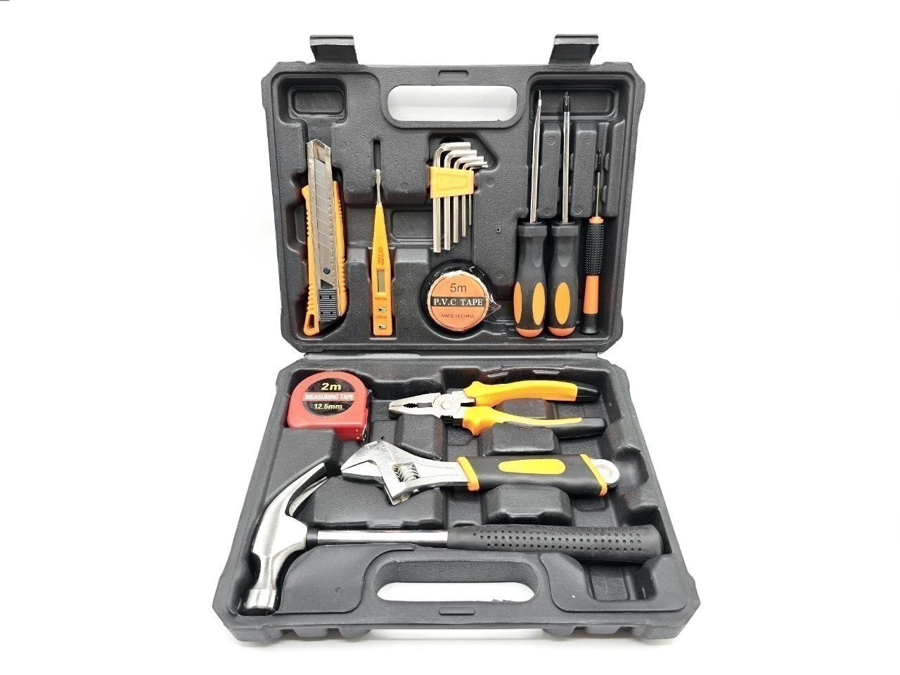 آچار فرانسه سایز ۸ روکش دار، انبردست، چکش میخ کش فلزی، مجموعه آچار آلن، کاتر سایز بزرگ روکش دار، متر ۲ متری ، پیچ گوشتی دوسو و چهارسو سایز بزرگ، پیچ گوشتی چهار سو سایز ریز، چسب برق، فازمتر دیجیتال، پیچ گوشتی موبایلی چهارسو
